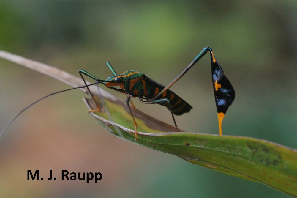 A fantastic tropical leaffooted bug, a.k.a. flag–footed bug, in the genus Diactor shows off a remarkable flag on its remaining hind leg. What happened to the other leg? Let’s find out.