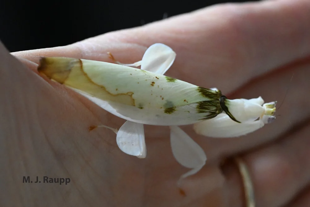 The evolution of insects to mimic the shape, color, and movement of plant parts has been witnessed in other episodes of Bug of the Week, where we visited walking sticks from Vietnam and spiny leaf insects from Australia. Resembling a plant part is a clever ruse believed to have evolved in many insects to escape the hungry eyes of vertebrate predators with a taste for insects. This form of deception is called masquerade, resembling an inedible object to fool an enemy. However, the uncanny resemblance of the orchid mantis to a blossom takes the art of deception one step further.