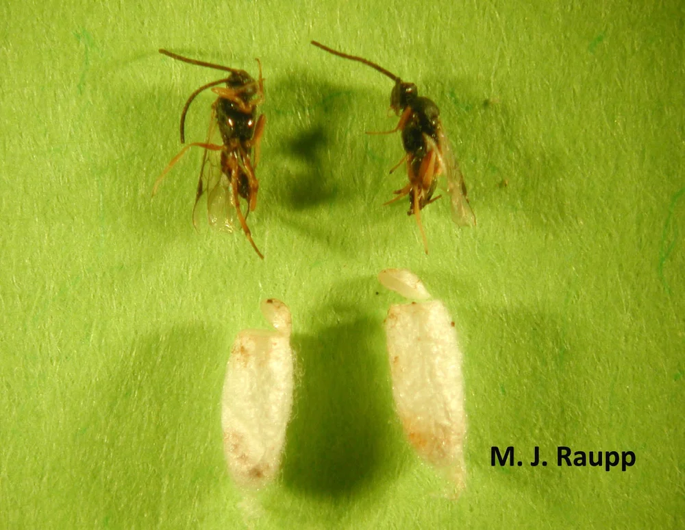 Small Cotesia wasp larvae develop inside catalpa sphinx caterpillars before emerging through the cuticle and spinning white cocoons on the surface of their hapless host.
